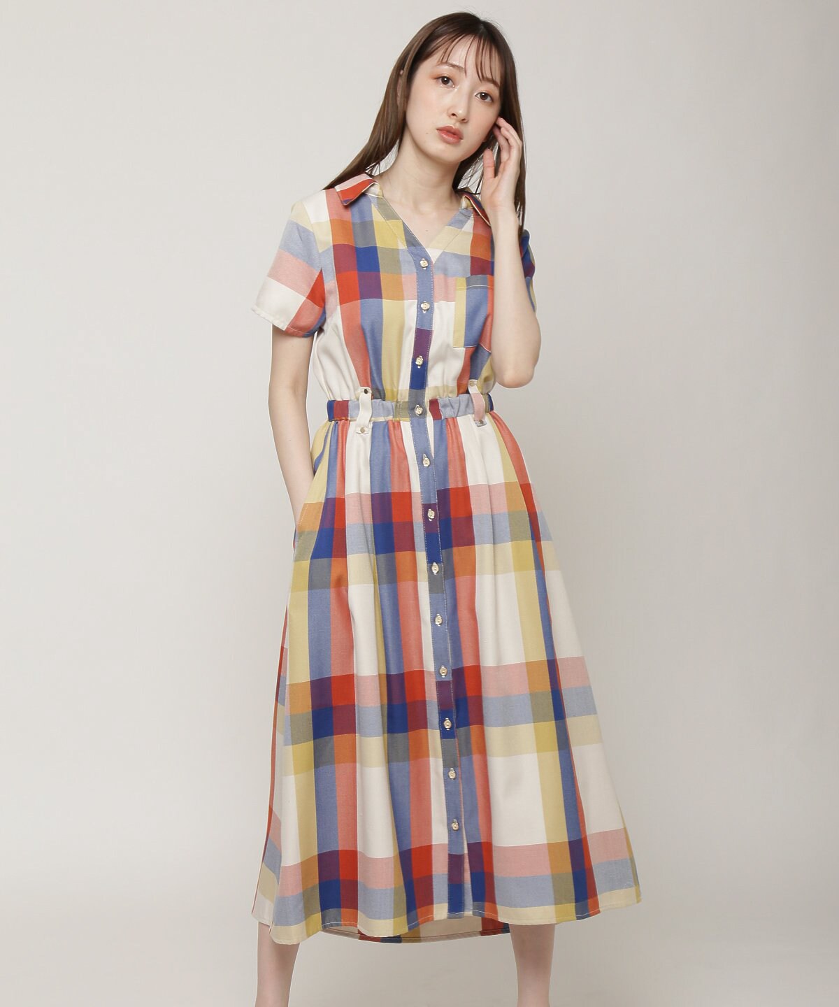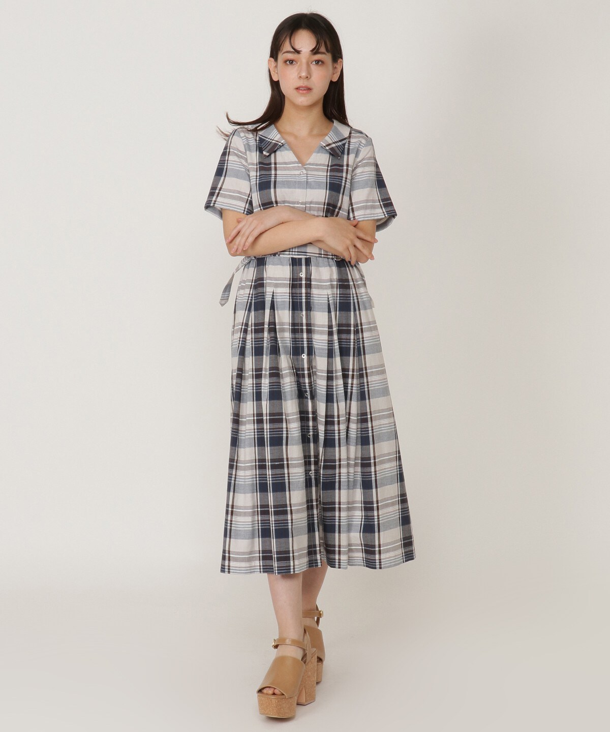 ウエストベルトシャツ衿チェックワンピース