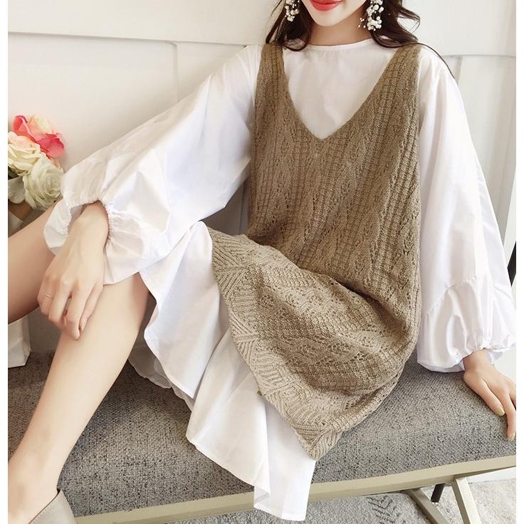 amazon co jp taiteng ワンピース レディース 膝丈 シャツワンピース 長袖 セットアップ ベスト ショート丈 カジュアル aライン 韓国ファッション ワンピ 2点セット 可愛い free白 服 ファッション小物